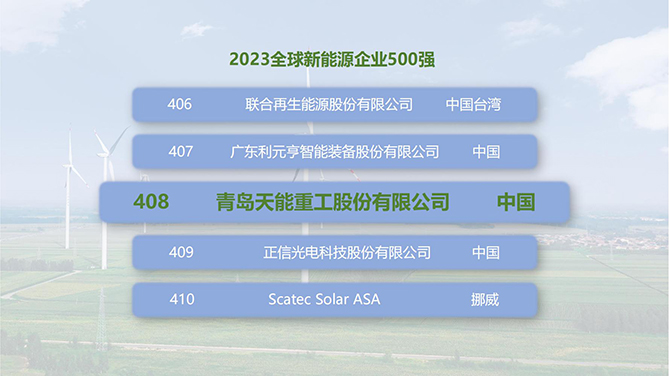 天能重工荣登2023全球新能源企业500强