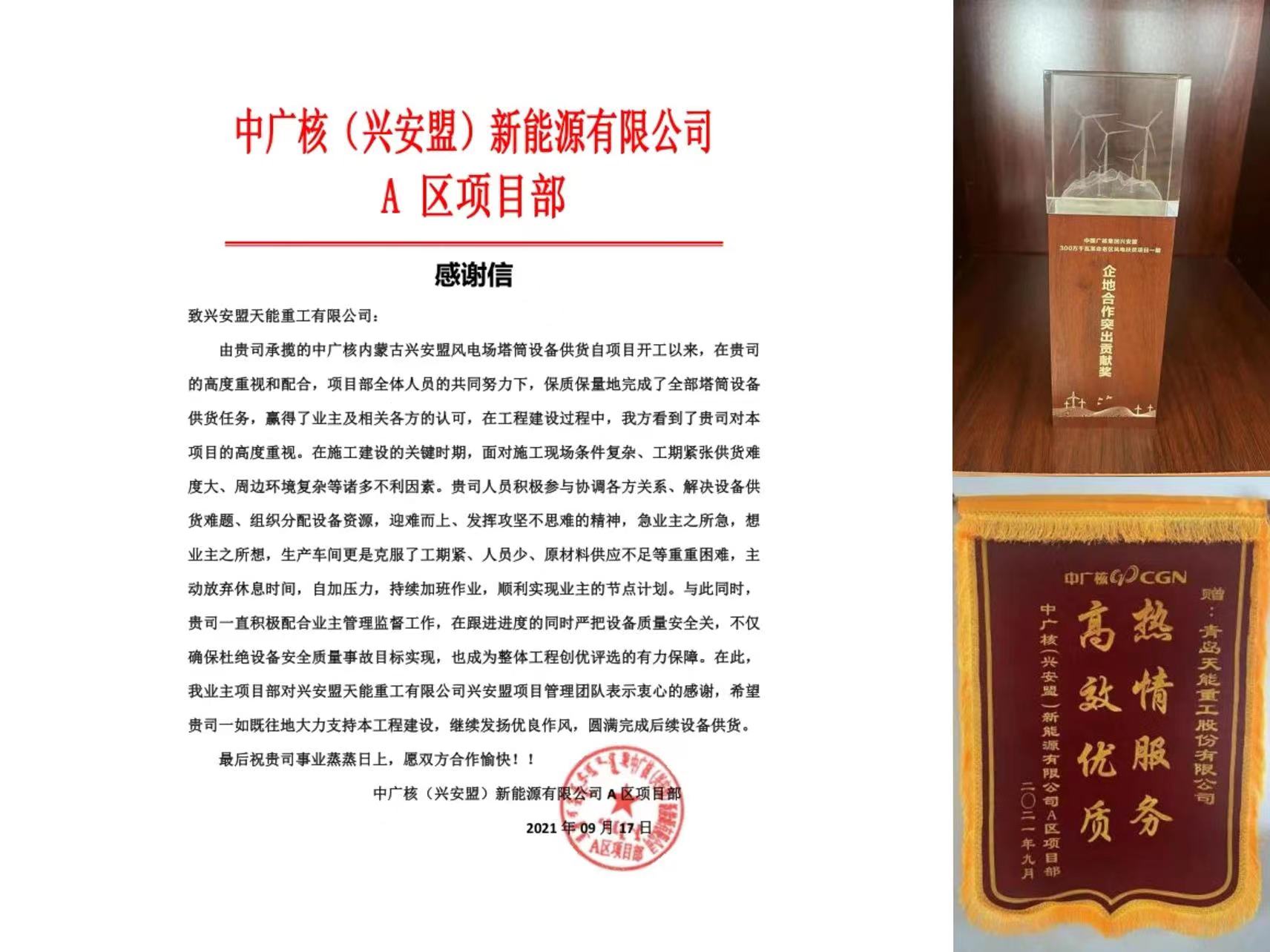 为保证项目塔筒顺利交付,天能重工克服施工现场条件复杂、工期紧张供货难度大、疫情反复等诸多不利因素,积极筹备前期物资采购工作,及时跟进落实原材料供货进度,加班加点推进塔筒生产制造,并按照不同机型塔筒发货顺序制定不同的排产计划,经过长达26个月的艰苦奋战,保质保量按时完成351台塔筒的交付,彰显了天能重工锐意进取的精神风貌、优质卓越的质量管控、全面细致的服务保障,得到了中广核业主的高度评价,为双方下一步深化合作奠定了坚实基础。