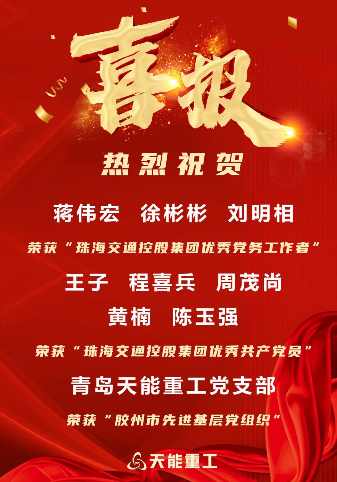 6月28日上午,珠海交通控股集团党委组织召开庆祝中国共产党成立103周年暨“七一”表彰大会,天能重工蒋伟宏、徐彬彬、刘明相等3位同志荣获“珠海交通控股集团优秀党务工作者”称号;王子、黄楠、程喜兵、周茂尚、陈玉强等5位同志荣获“珠海交通控股集团优秀共产党员”称号。在胶州市委“七一”表彰中,青岛天能重工党支部荣获“胶州市先进基层党组织”称号。