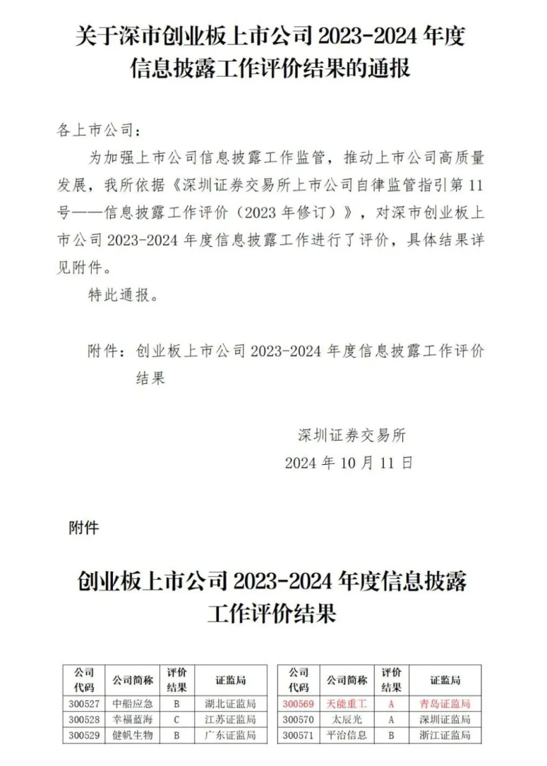 信息披露工作评价是深圳证券交易所对深市上市公司信息披露质量及相关工作的综合考评,是上市公司质量的重要体现,也是投资者投资决策的重要依据。天能重工荣获信息披露工作的最高评价等级,这充分展现了公司在信息披露方面所展现出的高度透明度和规范性,此荣誉的获得,是监管层、广大投资者以及资本市场对公司持续规范运营、重视信息披露并深切关注投资者利益的高度信任与认可,也是公司董事会、监事会、管理层高度重视信息披露、公司治理以及公司董办、财务等多部门紧密配合的结果。