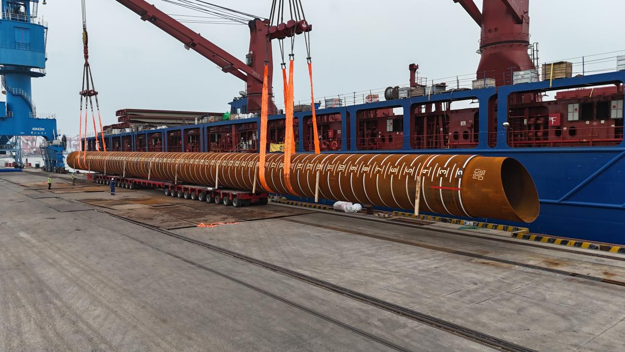 天能重工此次服务的海外油气项目共有7期,本次出口的45件管桩为海外油气项目首期交付产品,总重约1.1万吨,单品直径1.5–3米、壁厚50–100毫米,交付后将为当地油气资源开发提供关键基础设施支持。