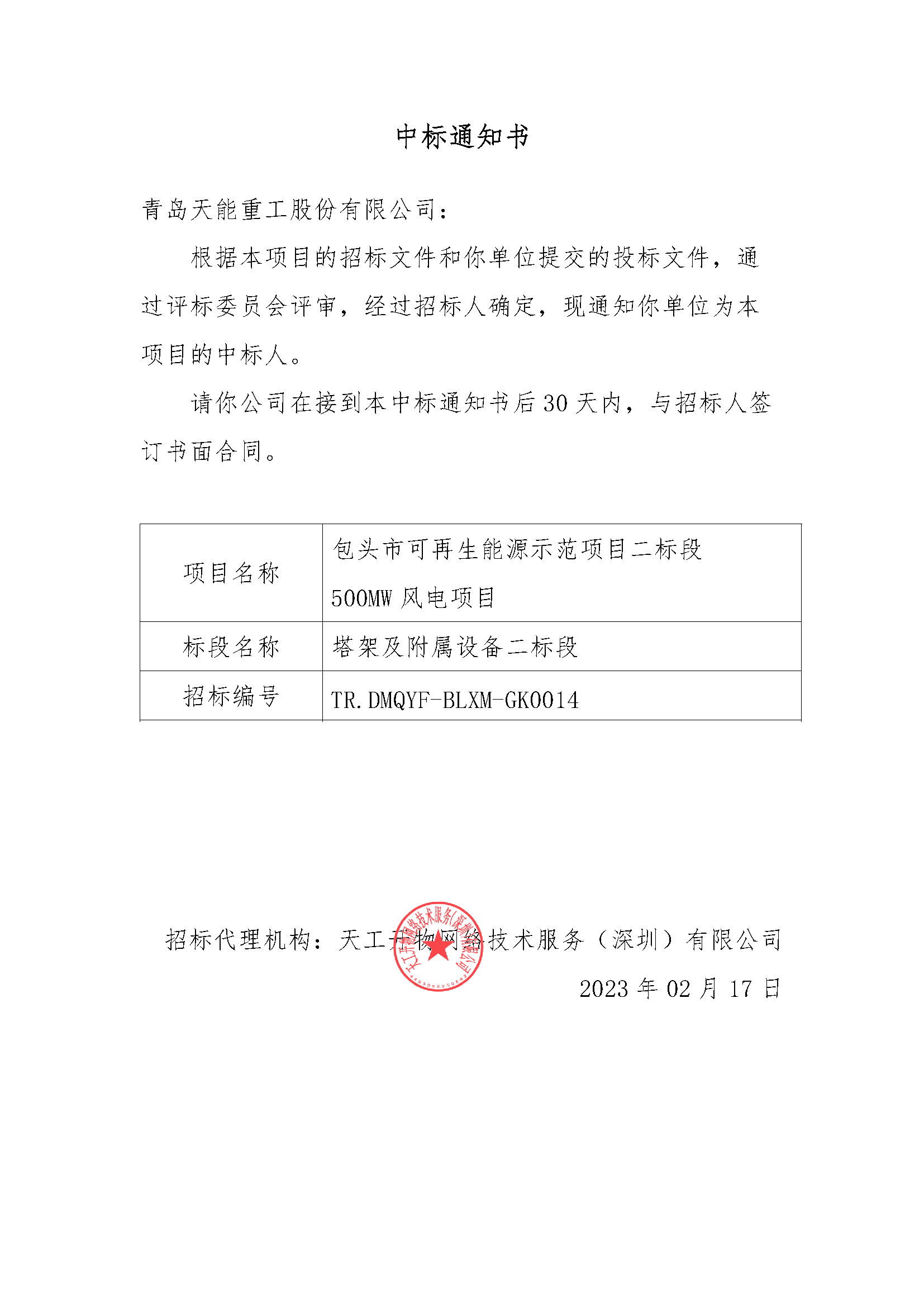 天能重工中标包头市可再生能源示范项目二标段500MW风电项目塔筒采购